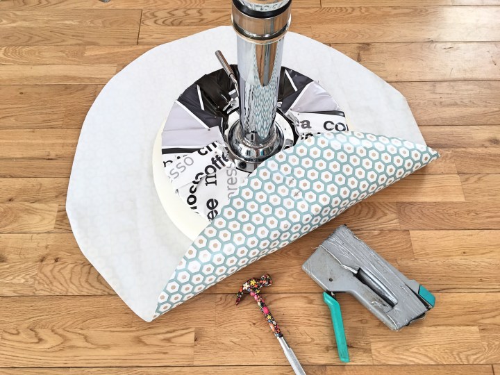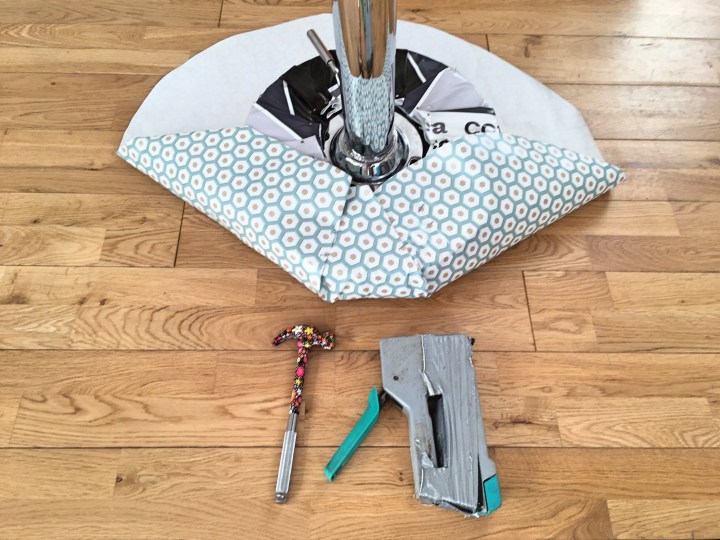 En fonction du matériel à disposition, vous pouvez soit clouer chaque pan du tissu à votre tabouret ou alors, technique super facile, vous pouvez l’agrafer au fur et à mesure.
